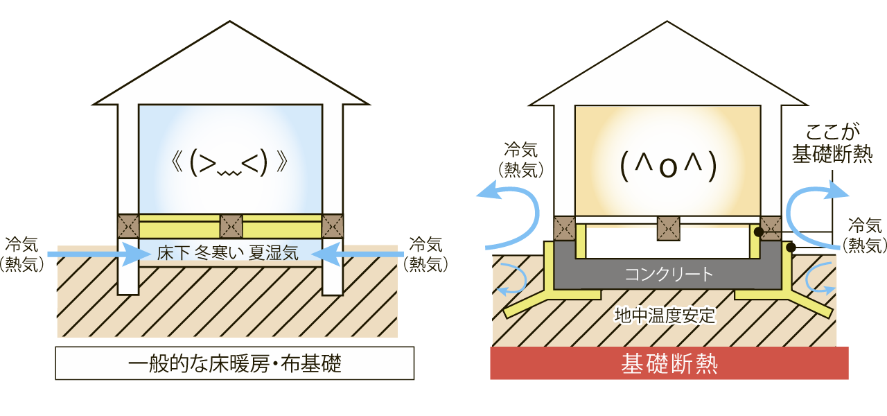 床下に断熱材を施工せず、基礎の立ち上り部分に断熱材を施工し、建物の外周部で断熱を行う工法です。この工法は、床断熱に替わる断熱技術として外国で生まれ、北海道の住宅で試行、検証され、昭和50年代に寒冷地の汎用技術として確立しました。基礎断熱は床下換気口がなく、密閉されるので外気の影響を受けず、室内環境の安定につながります。