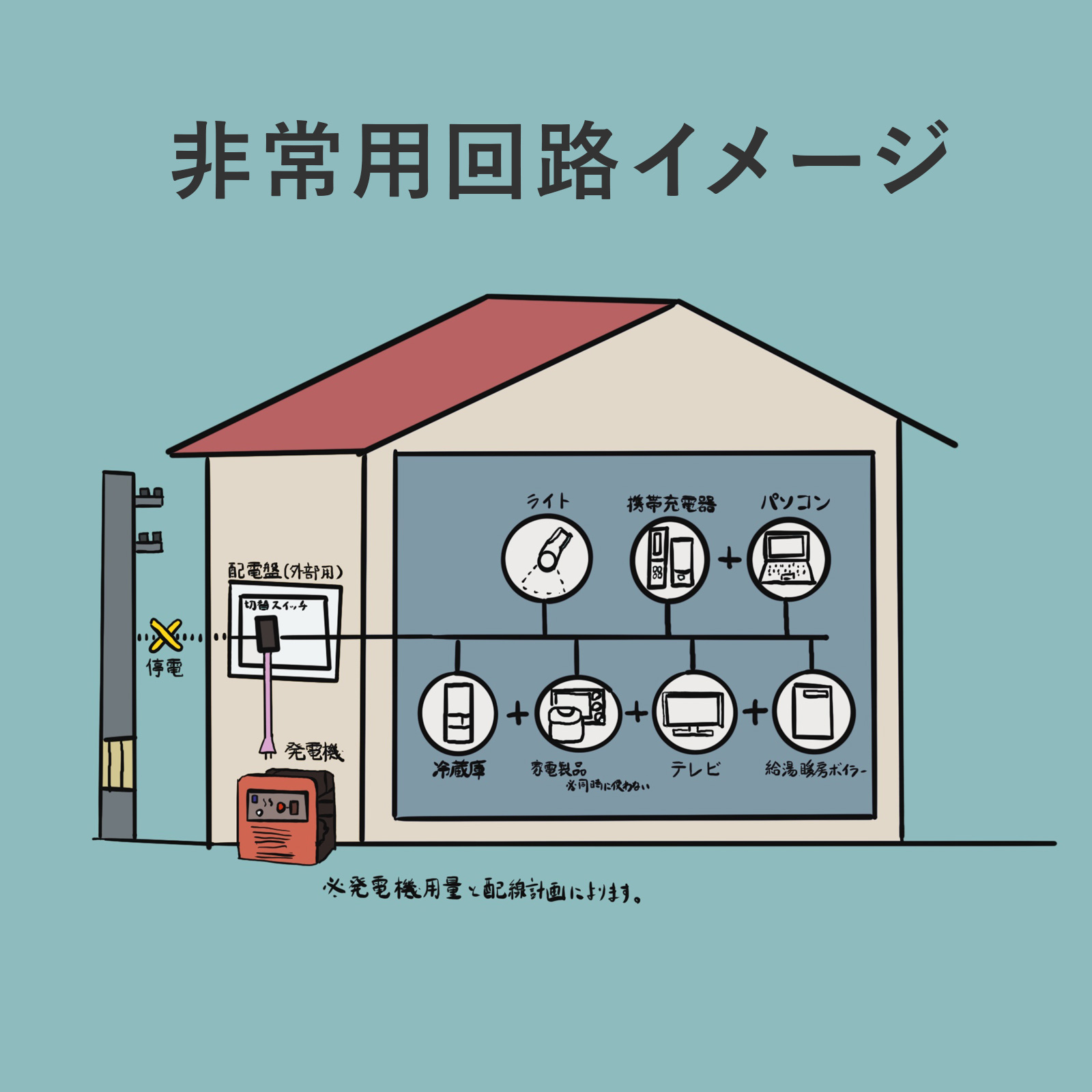 外部発電機と住宅を繋ぐことで、非常時の電気を確保することができ、停電時でも一部の電気機器や家電製品を使用することができます。